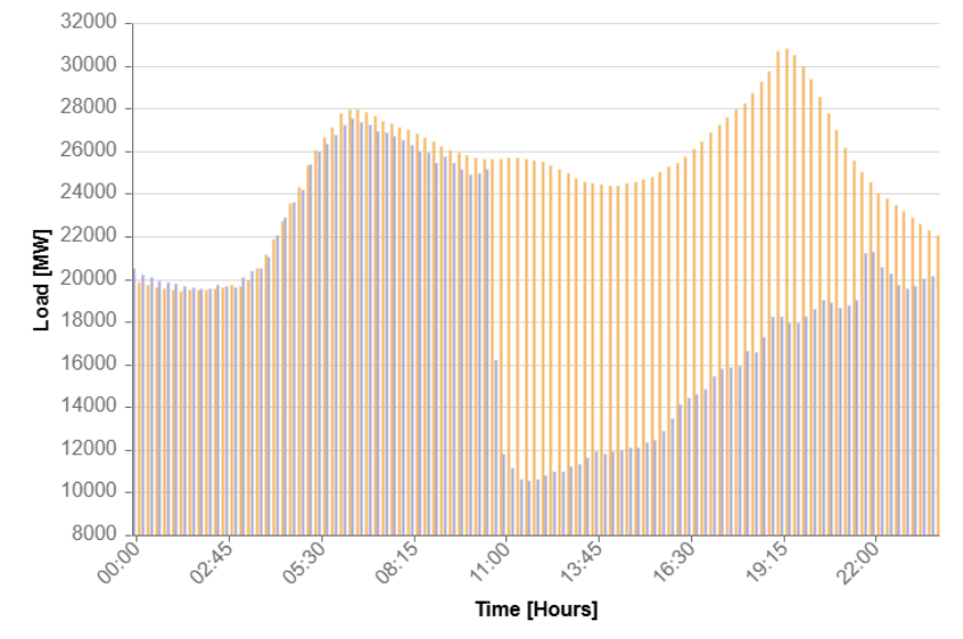 Carico energetico totale in Spagna del 28 aprile 2025. In giallo la previsione del carico totale giornaliero, in blu il carico totale effettivo. Fonte: Entso-e, gestore del sistema elettrico europeo, 2025.