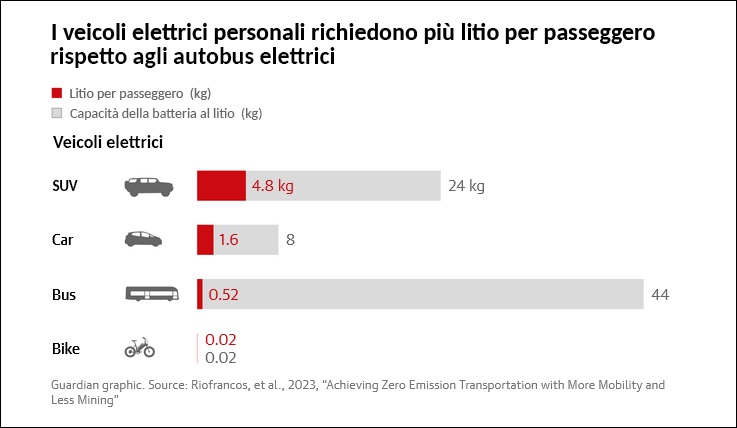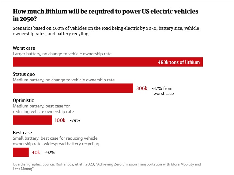 Se gli americani continueranno a dipendere dalle automobili al ritmo attuale, entro il 2050 i soli Stati Uniti avranno bisogno di una quantità di litio tripla rispetto a quella attualmente prodotta per l'intero mercato mondiale, con conseguenze disastrose per l'approvvigionamento idrico e alimentare, la biodiversità e i diritti degli indigeni.