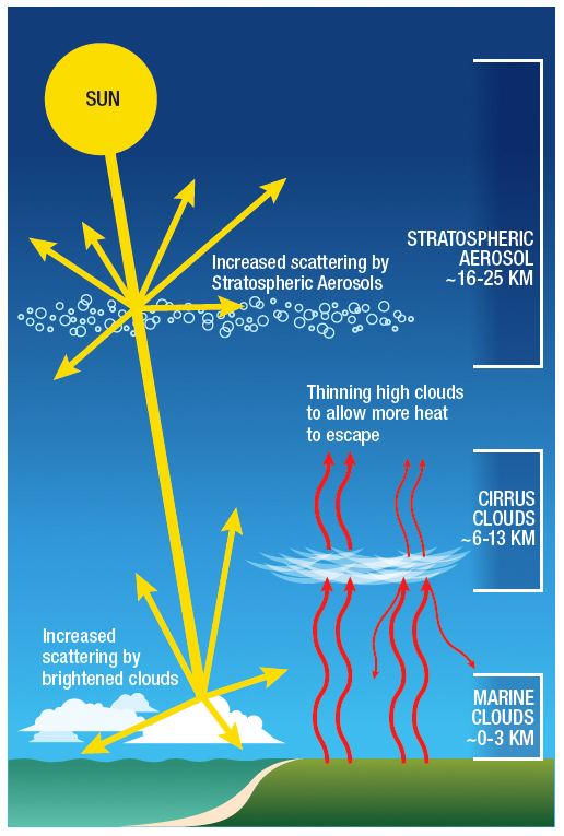 • Assottigliamento delle nuvole cirri (Cirrus Cloud Thinning, CCT), con aumento della trasparenza delle nuvole ghiacciate in modo da favorire la radiazione infrarossa in uscita.