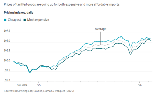L'amministrazione Trump sostiene che gli aumenti delle tariffe doganali sulle importazioni negli Stati Uniti dallo scorso aprile (ora giudicati illegali dalla Corte Suprema degli Stati Uniti) non abbiano avuto alcun effetto sull'inflazione. Ma le ultime analisi suggeriscono che non è così. Il Congressional Budget Office (CBO) stima che le aziende e i consumatori statunitensi stiano ora sostenendo il 95% dell'aumento dei dazi, in particolare sui prodotti alimentari importati. I dazi sulle importazioni alimentari sono aumentati del 44%, il che equivale a un'imposta del 12% sui consumatori. Questa analisi è stata confermata dalla Federal Reserve di New York, che ha concluso che «i prezzi delle importazioni statunitensi per i beni soggetti alla tariffa media sono aumentati dell'11%... più di quelli per i beni non soggetti a tariffe» e che «le aziende e i consumatori statunitensi continuano a sostenere la maggior parte dell'onere economico delle elevate tariffe imposte nel 2025». L'aumento delle tariffe, del costo del lavoro e dell'assicurazione sanitaria ha spinto molte aziende ad aumentare i prezzi. «Dopo aver mantenuto invariati i prezzi per diversi mesi, le aziende, grandi e piccole, hanno avviato una nuova serie di aumenti, in alcuni casi di entità elevata a una cifra».