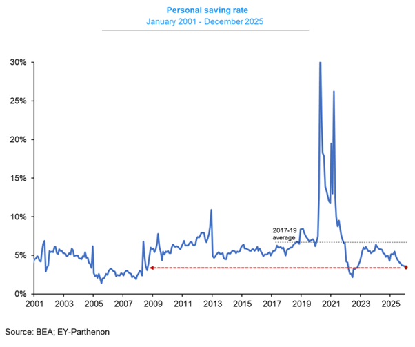 Ciò significa che nel 2025 gli americani hanno sostenuto i propri bisogni di consumo solo attingendo ai propri risparmi e aumentando il debito. In dicembre, il tasso di risparmio personale è sceso al 3,6% del reddito, in calo di 1,9 punti percentuali rispetto ad aprile 2025.