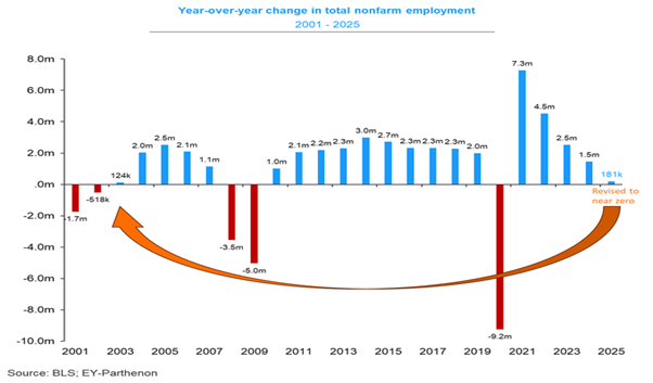 A prima vista, il dato relativo alla crescita dell'occupazione nel mese di gennaio sembrava positivo, con un aumento di 130.000 unità. Tuttavia, gli aumenti registrati a novembre e dicembre sono stati rivisti al ribasso. Ma ancora più importante, sono state apportate revisioni ancora più significative al dato complessivo del 2025, che ha evidenziato come lo scorso anno sia stato il più debole in termini di creazione di posti di lavoro al di fuori delle recessioni degli ultimi vent'anni. L'economia statunitense ha creato solo 181.000 posti di lavoro nel 2025, ovvero appena 15.000 posti di lavoro in più al mese.